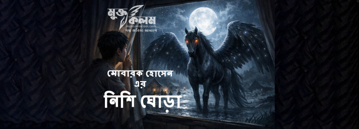 রাত গভীর হলেই আমার জানালার বাইরে বাতাসের শব্দ বদলে যায়।সাধারণ বাতাস নয়—ডানার ফিসফিস, যেন আকাশ নিজেই নিঃশ্বাস নিচ্ছে।আমি জানি, সে এসেছে।জানালার কাঁচে হালকা ঠুকঠুক শব্দ হয়। পর্দা সরাতেই দেখি—চাঁদের আলোয় দাঁড়িয়ে আছে এক আশ্চর্য ঘোড়া। শরীর কালচে রুপোলি, চোখ দু’টো জ্বলন্ত অঙ্গারের মতো, আর পিঠ থেকে বেরিয়ে আছে বিশাল, জমকালো পাখা। প্রতিটি পালকে যেন রাতের তারারা ঘুমিয়ে আছে।ওর নাম আমি দিয়েছি—নিশি।আমাদের সম্পর্ক আজ সাত বছরের।কেউ জানে না। জানলেও বিশ্বাস করত না।প্রথম দেখা হয়েছিল আমার জীবনের সবচেয়ে ভয়ংকর রাতে। তখন আমার বয়স পনেরো। গ্রামের বাঁধ ভেঙে নদীর পানি ঢুকছিল। চারদিকে অন্ধকার, বিদ্যুৎ নেই, মানুষের কান্না আর পানির গর্জন মিলেমিশে একাকার।